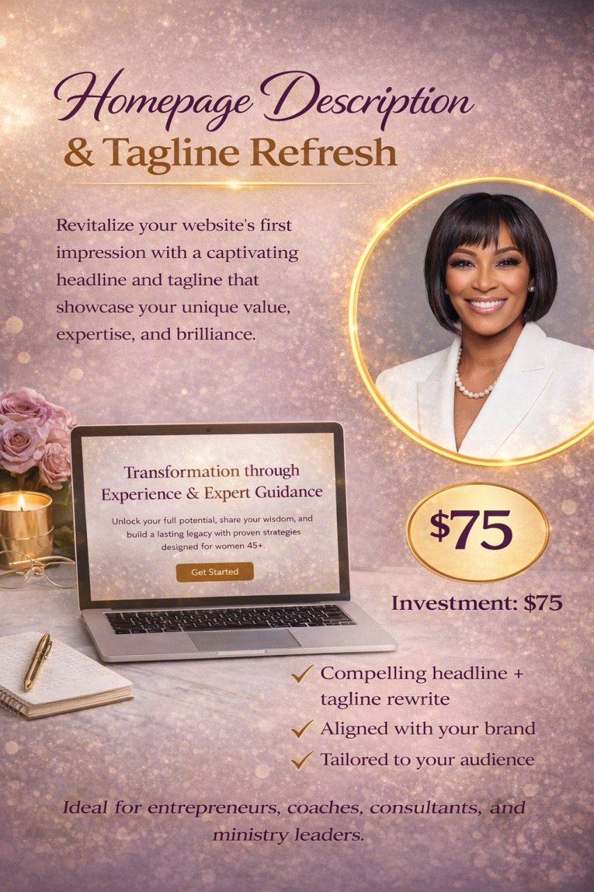 We’ll update your homepage headline and tagline so visitors instantly understand who you serve and how you help—clear, professional, and welcoming.